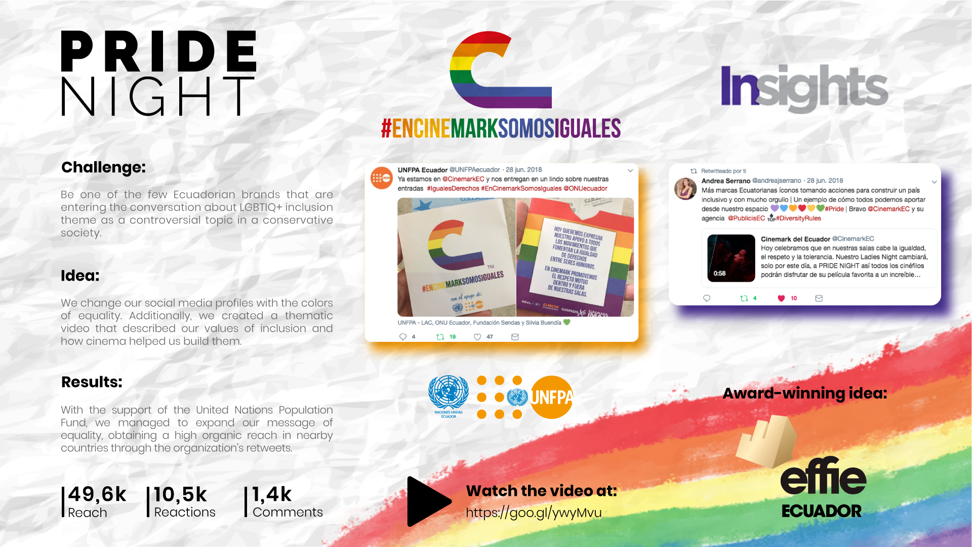 Winner of the Effie Ecuador award for the "Pride Night" social campaign in conjunction with UNFPA.