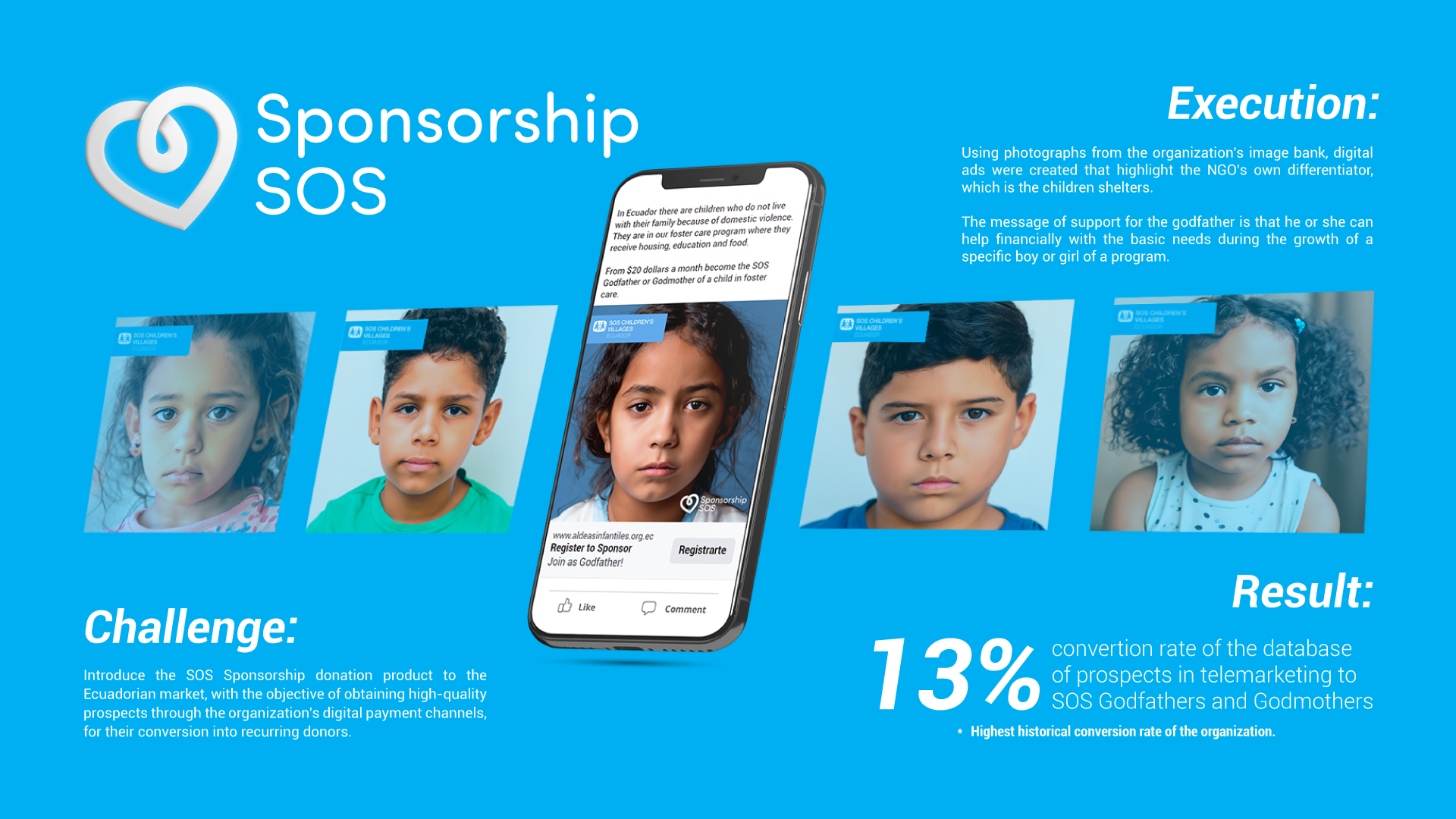 Digital campaign to introduce the sponsorship market for SOS Children’s Villages Ecuador through C2C to obtain godmothers and godfathers for children and adolescents in foster care.
