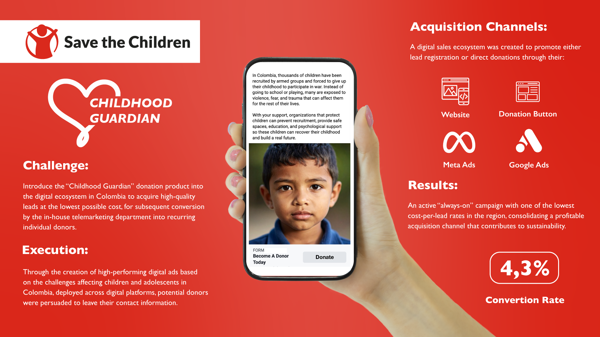 Leader of the best C2C strategy in LATAM of 2021 in SOS Children's Villages Ecuador and market launch for Central America and the Caribbean for Plan International.